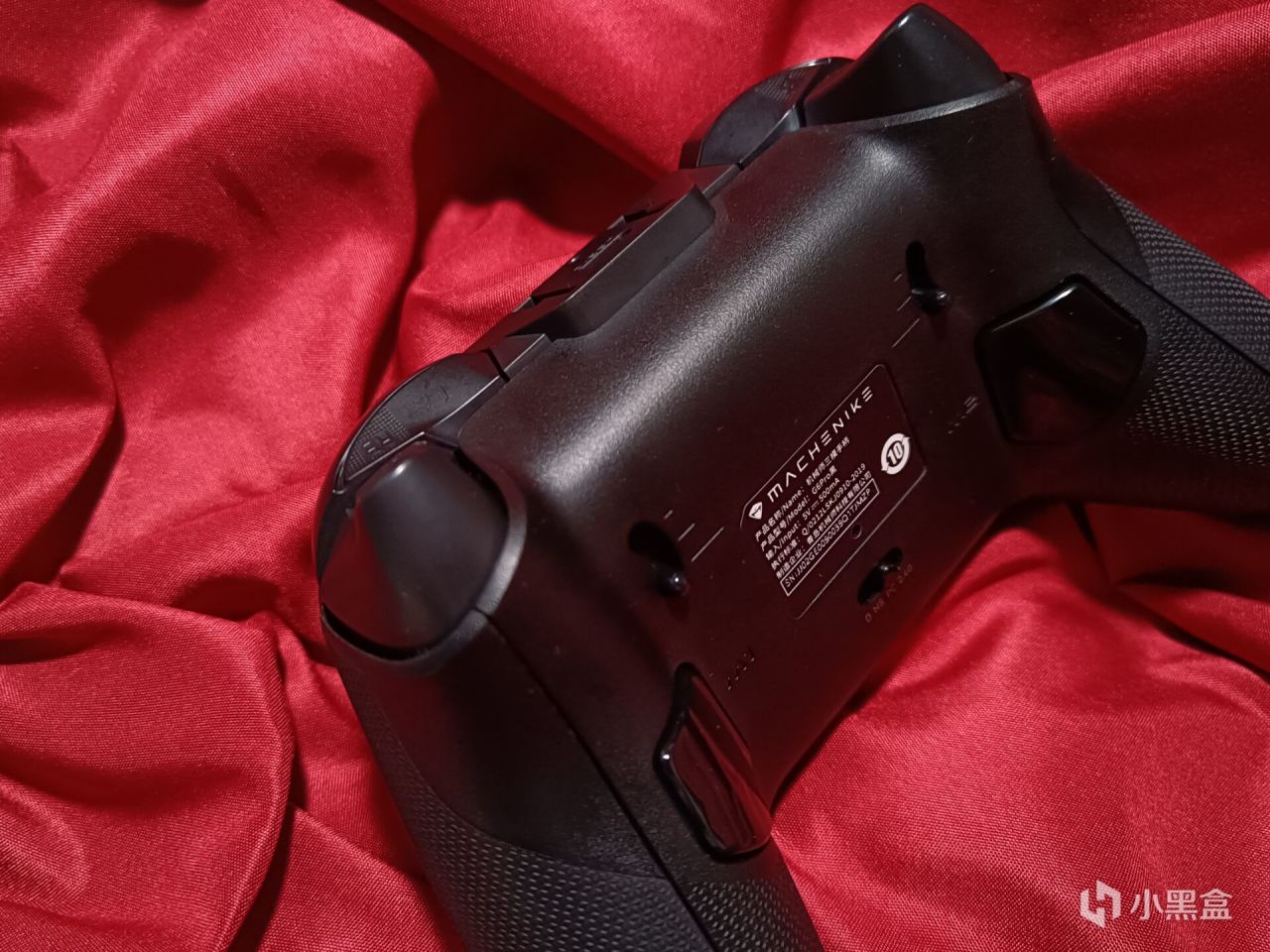 手柄握把方面采用了硅胶握把,使用的是四边形防滑纹路,触感舒适,防滑效果还算不错,背部是做了两颗大背键,支持按键映射和宏录制,下方做了一个用来切换连接方式以及适配协议的拨杆开关,扳机位置也是布置了扳机锁。