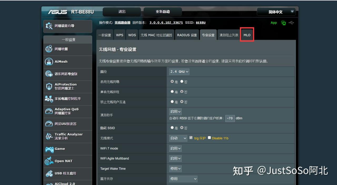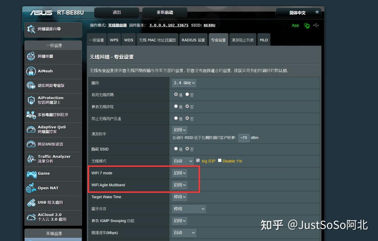 ▼华硕路由器开启Wi-Fi 7与MLO有自己独特的一套逻辑,对小白来说可能需要费一点心思才能搞定,首先需要进入到无线设置➡专业设置里面开启Wi-Fi 7 mode与WiFi Agile Multiband两个功能。