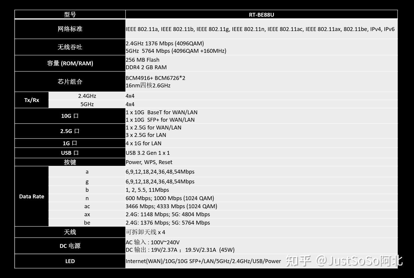 ▼RT-BE88U是一款双频7200MHz路由器,其中2.4GHz网络带宽1376Mbps,5GHz网络带宽5764Mbps,两个频率都支持4096QAM,5GHz网路支持160MHz。