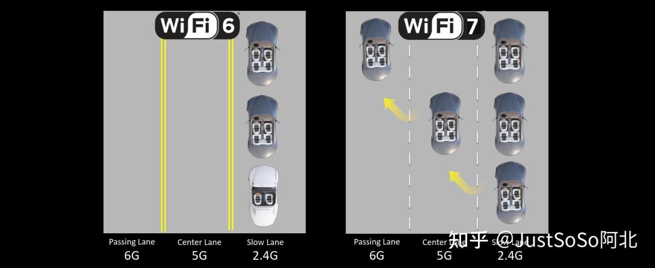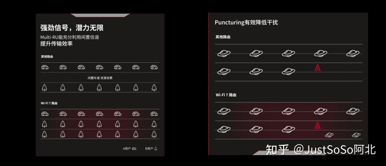 ·MRU允许在传输中使用不同大小的资源单元,可以根据用户的需求和信道条件动态调整资源分配。通俗点来讲,就是Wi-Fi 5的时候相当于快递员一次只能送一件,送完一件才能送下一件;到了Wi-Fi6的时候相当于快递员推上了小板车,能一次多拉几件不同人的货(多用户同一时间共享信道资源),但是这个板车上面预制了小格子(子载波/子信道),每个用户只能占用一个格子,遇到大货的时候只能拆成小盒多跑几趟去运输;到了Wifi 7时代,快递员发现,欸?把格子拆了拉快递更方便,这样就不用把大盒子拆成小盒子来回跑了,一趟解决,由此就带来了更低的网络延迟。