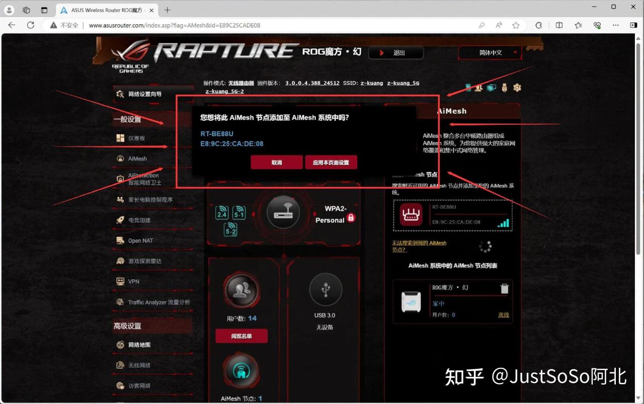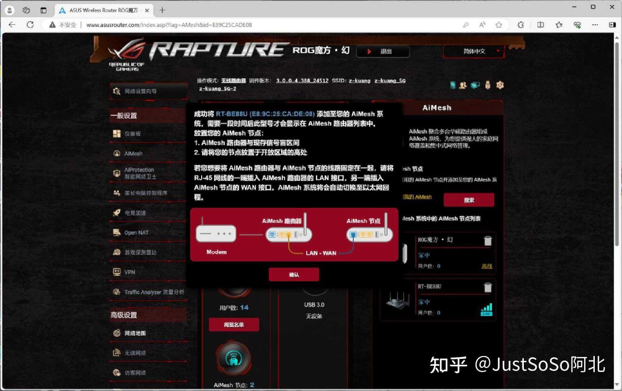 ▼打开主路由的后台管理WEB页面就能看到弹窗,提示是否将RT-BE88U AiMesh节点添加至AiMesh系统,系统推荐初次组网距离控制在3m以内,亲测3m还隔一堵墙也没问题。