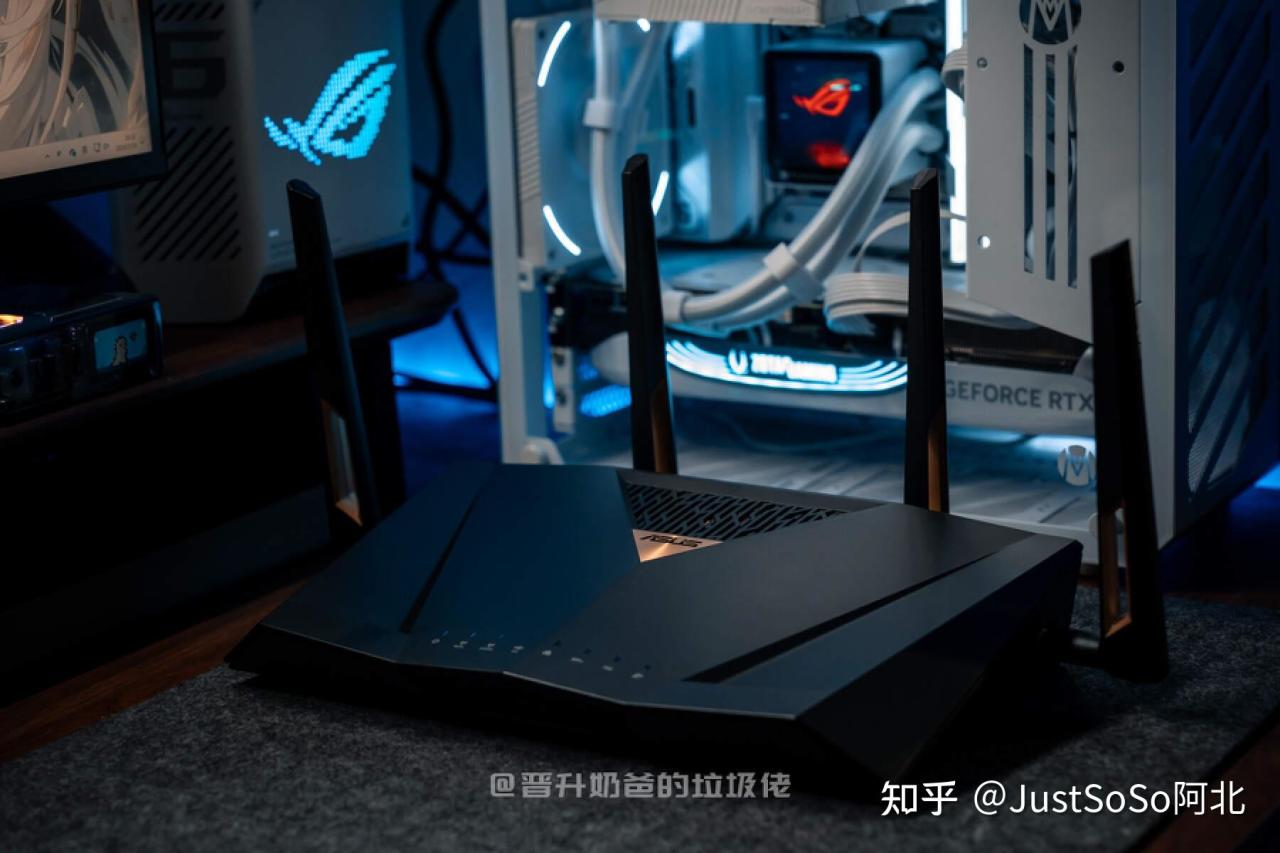 ▼华硕RT-BE88U的块头还是蛮大的,当然,换一种说法就是用料足、散热强,不重要。路由器摆在75cm宽的桌面上刚刚好,并不会有突兀的感觉。