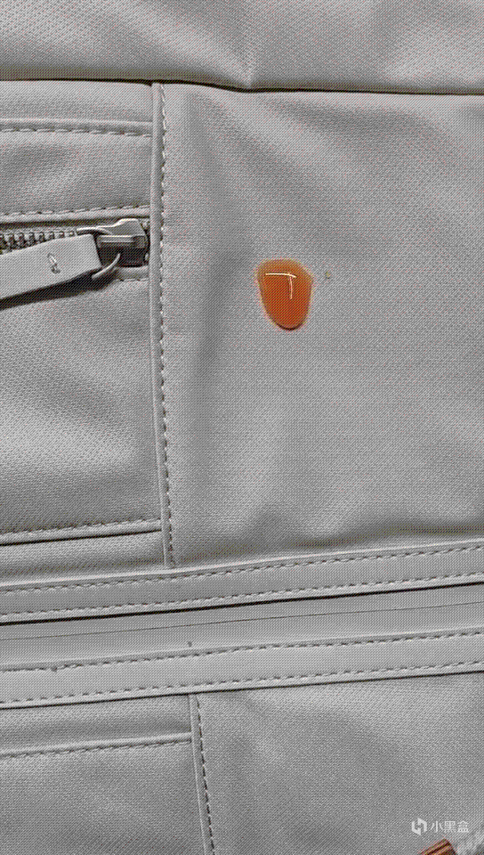 背包的表面材质为100%尼龙细纹小提花面料。整体手感非常不错,摸上去非常细腻,据其官网介绍,这个面料是做到了增加防静电、防水、防油污的三防处理。那既然都这么说了,那必须测试一波,于是我用了颜色比较深的番茄汁进行测试,番茄汁倒在表面之后并不会渗透进去,用纸巾轻轻擦拭就非常赶紧。能看到这个面料确实防水且防油污,即便是白色也是非常耐脏的。