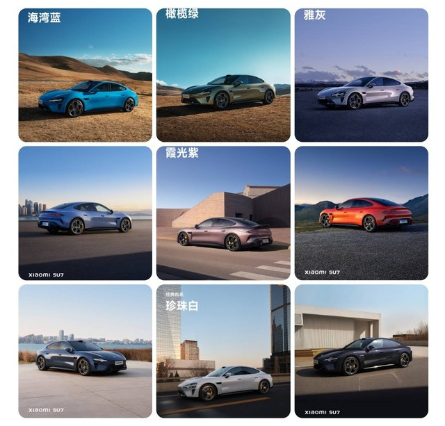 小米汽车SU7一共9款颜色,四个色系,四款内饰,同时有种轮毂可选!