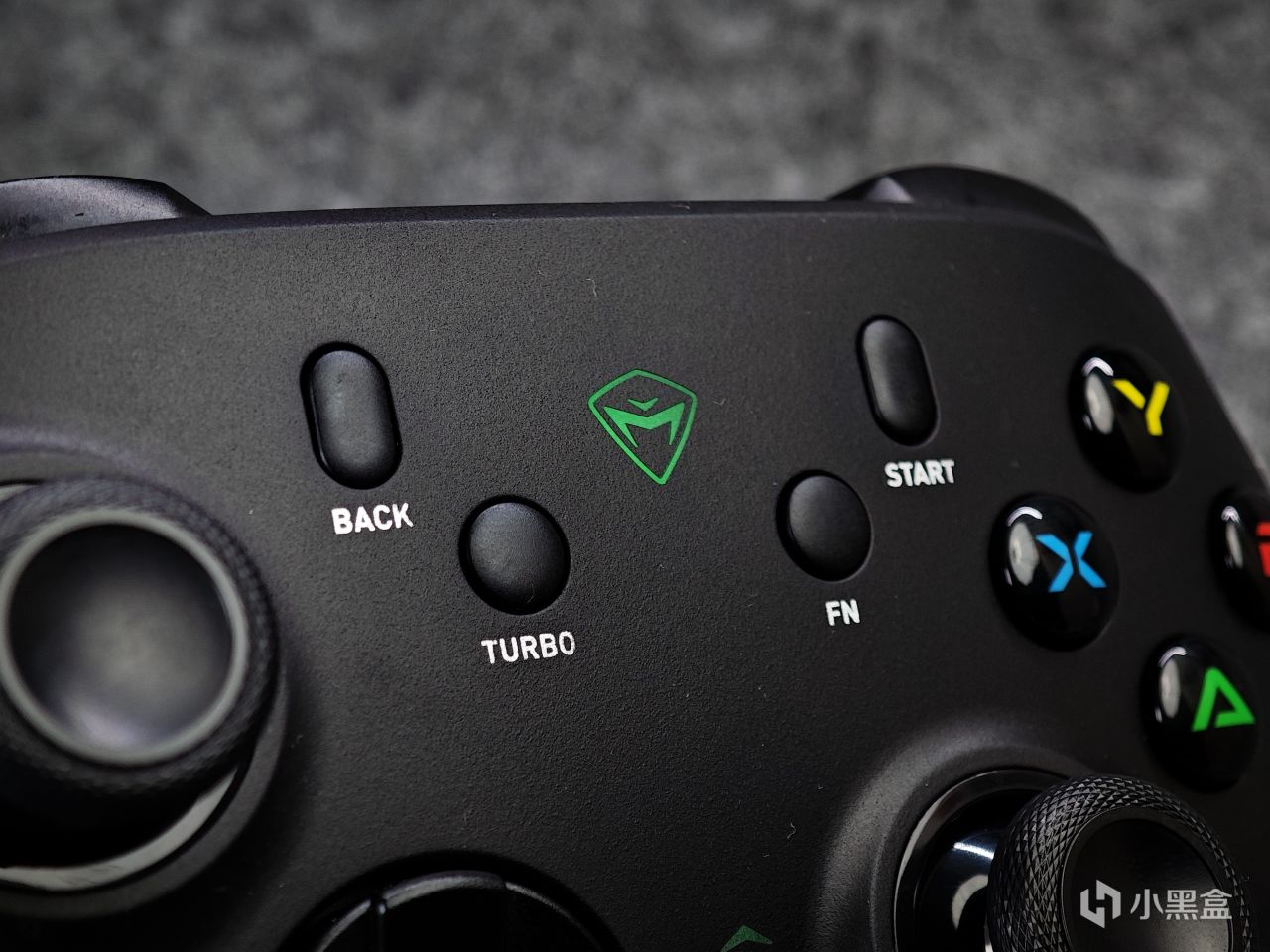在手柄上方可以看到除了常规的BACK和START键之外,还额外添加了两颗按键,相信使用过国产手柄的用户都会很熟悉了。没错,就是连发键和“多功能键”,可以通过FN键+不同的按键来实现不同的功能,可以在免驱状态下对手柄进行一些简单的设置;而正下方则就是手柄的指示灯,以及开机键,可以通过这四颗指示灯来观察手柄的不同状态。