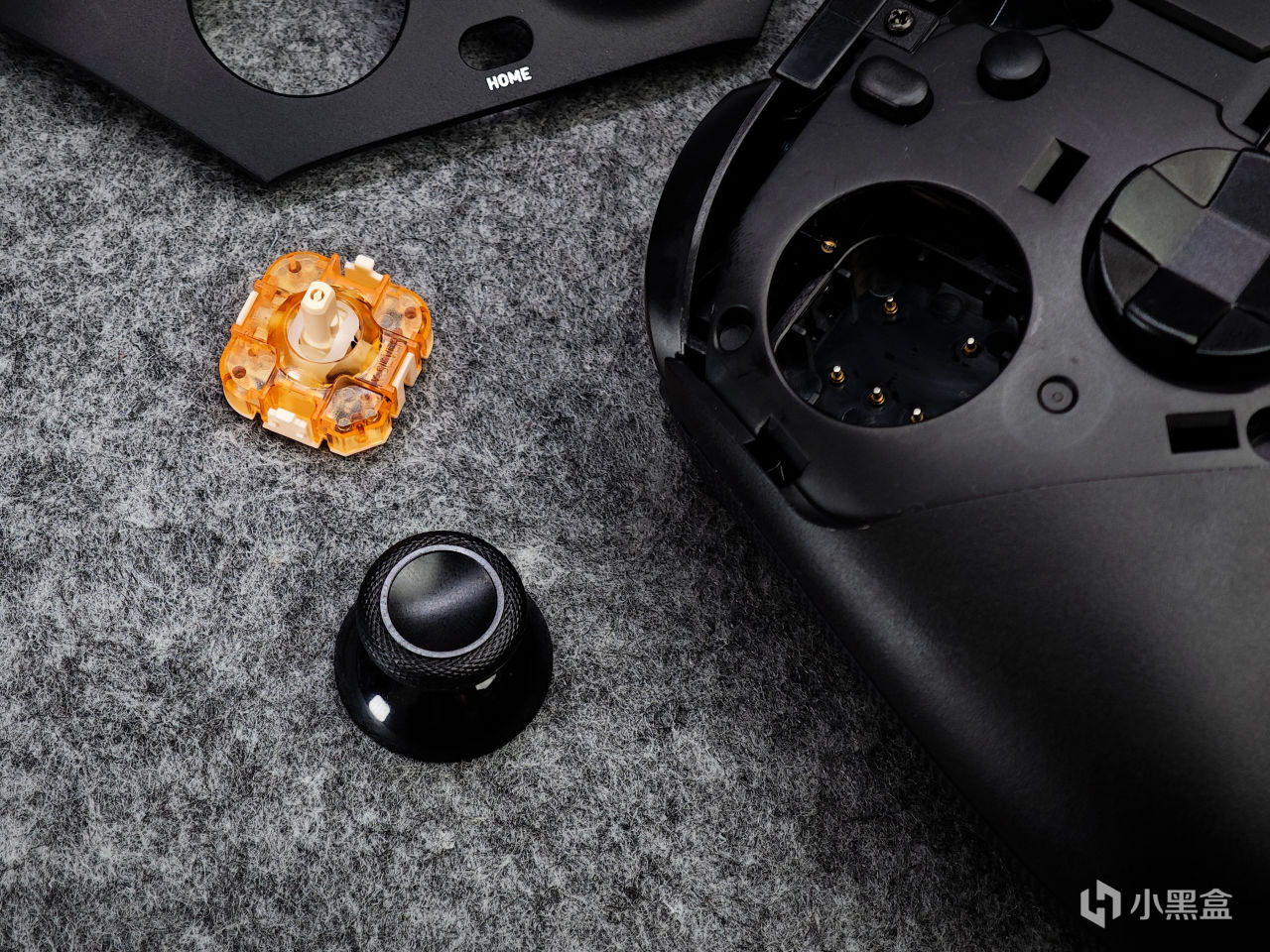 而更换的步骤却略显麻烦,首先需要将手柄表面的面壳给摘下,注意G6PRO的面壳并不是采用磁吸设计,而是卡扣设计,并且设计的相对较紧,因此在撬不开的时候偶尔需要大力出奇迹;摘下来后将摇杆帽给摘下,露出里面的霍尔元件,使用附赠的插拔器进行更换,随后安装好之后按照说明书进行校准即可。