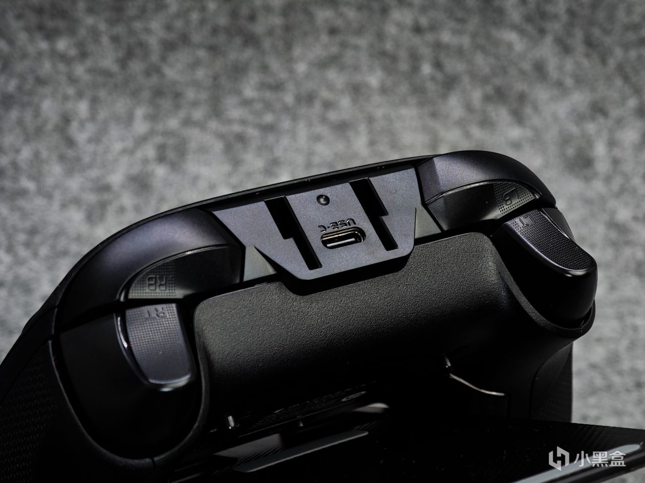 手柄顶部除了常规的Type-C接口之外,在旁边还有支持手柄手机支架的孔洞,在旁边则可以看到肩键以及扳机键上方的防滑纹。肩键方面采用的是转轴机构+轻触开关组合,整体的手感会更清脆一些。