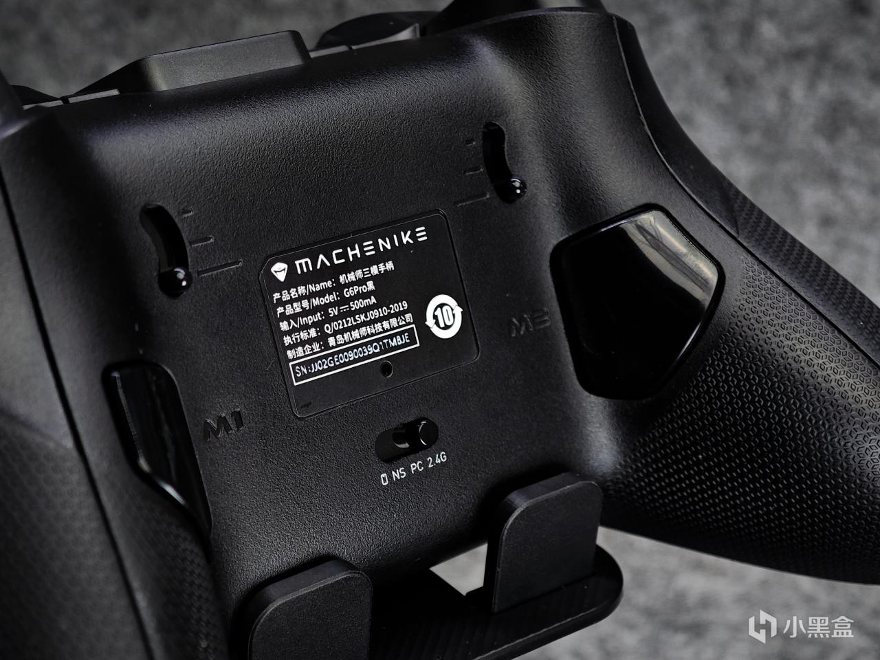 在手柄背面就可以看到刚提到的扳机切换开关了,在旁边刻有三段提示,搞得我一开始以为G6PRO还有一种扳机模式,不过后面翻阅说明书才发现只有长行程以及微动两种模式。。中间还是常规的手柄信息,在下方则是手柄的模式切换开关,除了NS/PC之外还支持手机连接。