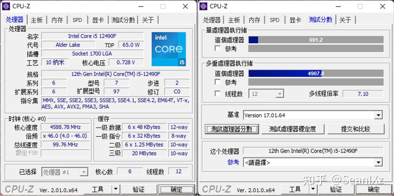 CPU-z版本2.01.0.x64,基准测试版本为17.01.64,多核4907.8分,单核得分为691.2,分数不错。