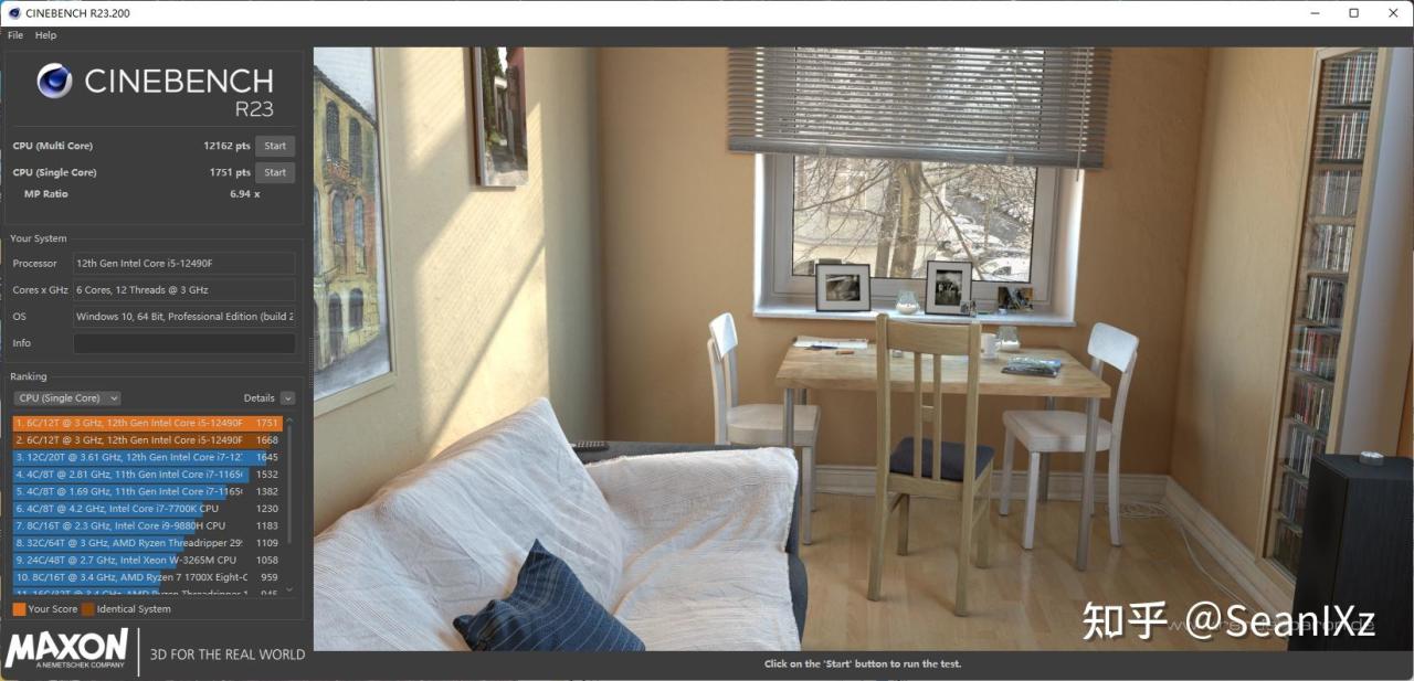R23测试中i5-12490F多核得分为12162pts,单核得分为1751pts,总体渲染效率还不错,是可以满足轻度生产力需求的。