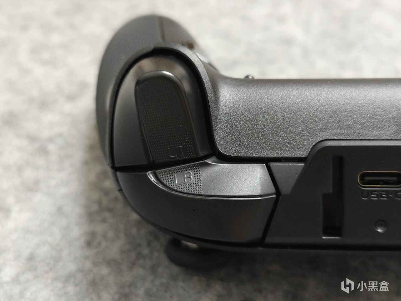 来到手柄的肩部,手柄的肩键采用轻触开关,按键手感不错,按键的统一感也很好。扳机采用的是两段式扳机设计,可以在9mm的霍尔线性扳机跟0.3mm的凯华微动中自由切换。我个人是非常喜欢这个扳机设计的,能够满足不同游戏的需求。扳机还带扳机震动,手柄的扳机跟肩键都有激光防滑纹设计,非常人性化。除此之外,肩部还有一个type-c充电口跟手机支架的槽位。