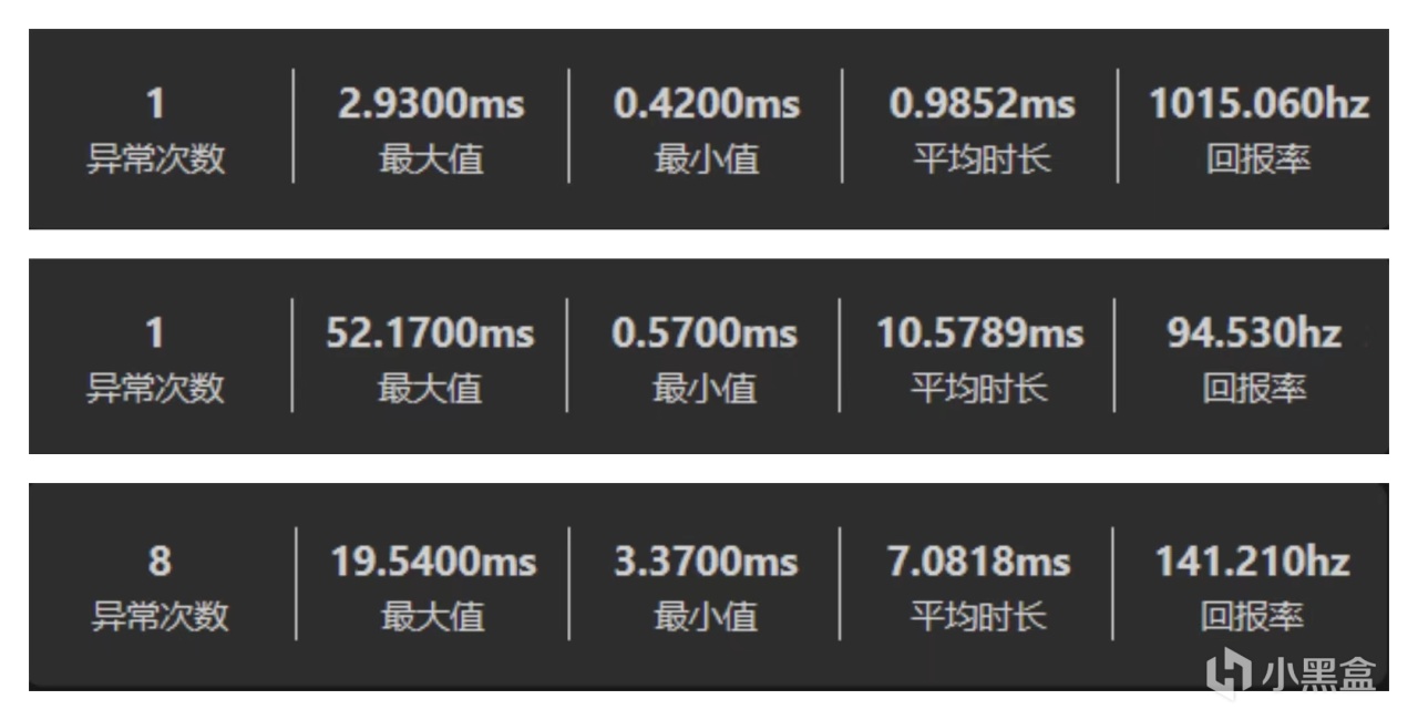 最后我们看看手柄的回报率测试,直接上图,从上到下依次是:有线、蓝牙、2.4g的测试成绩。能看到成绩都是非常不错的,特别是有线模式下,能达到1000Hz的回报率,即便是FPS也能胜任。