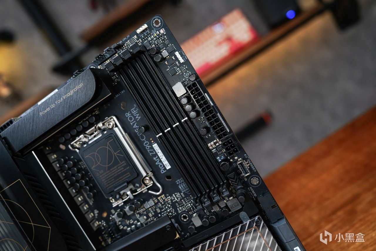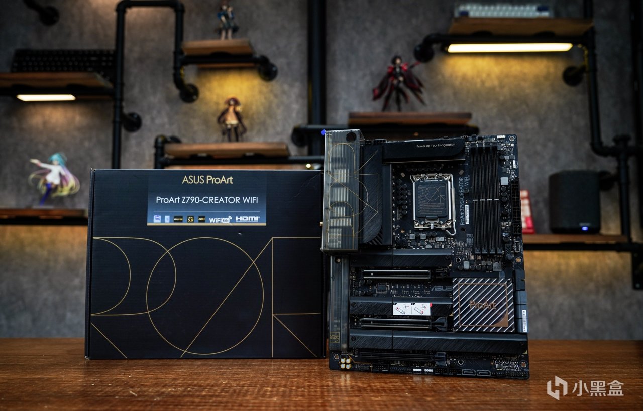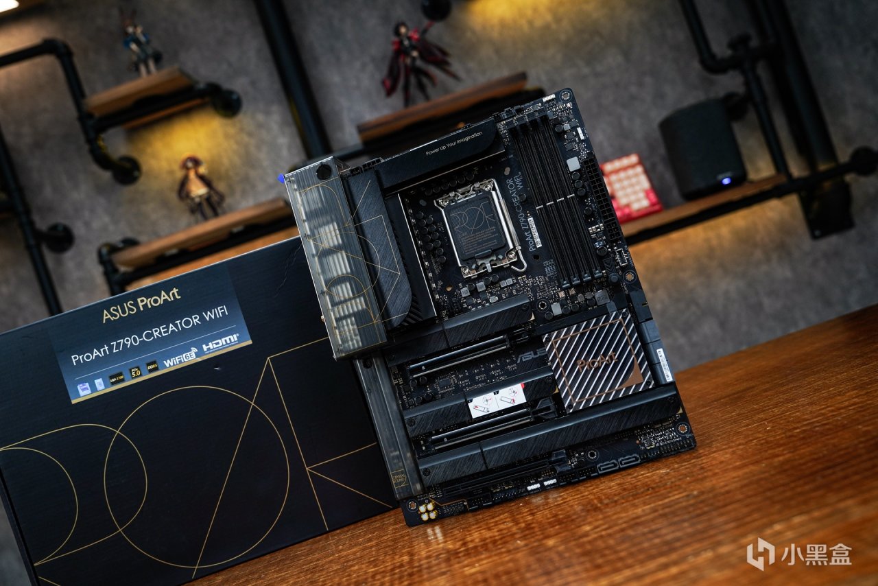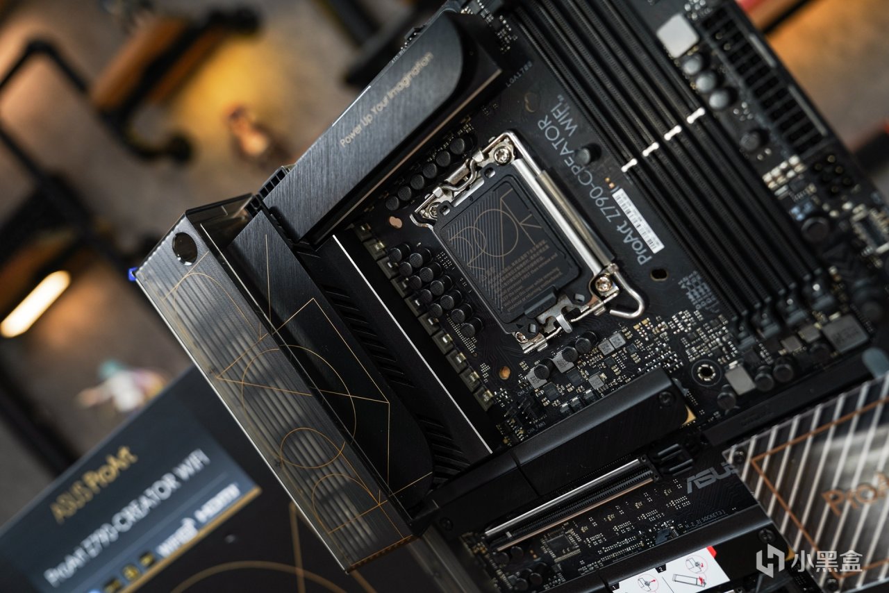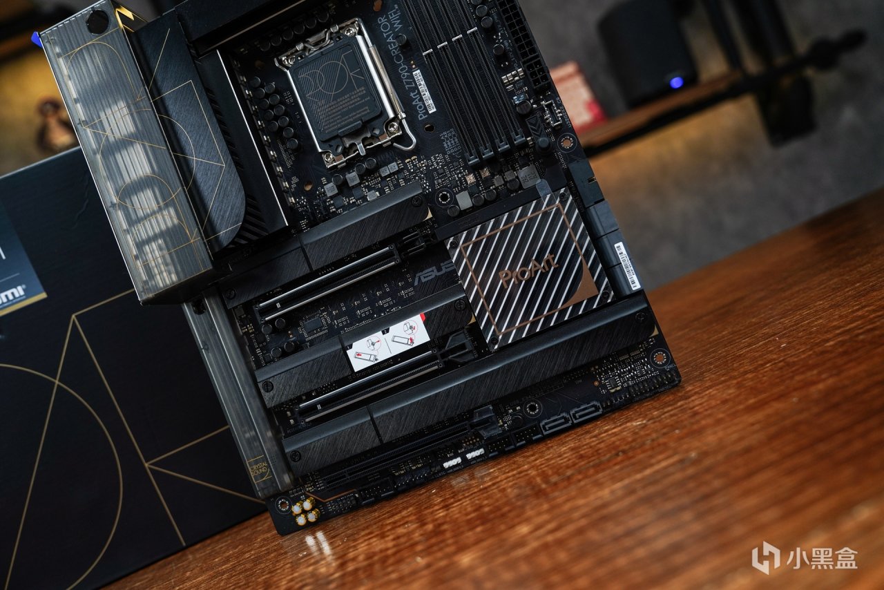 适配这种无光主机,特别是针对创作类主板是少之又少。而这张华硕 Pro Art Z790-CREATOR WIFI 主板作为一款定位于专业的创作者的产品,并不是针对游戏又或者是性能向的产品。针对创意工作者而言是需要更为专注的氛围感,摒弃华丽的外观设计和灯效装饰,实现无光的创作氛围。从主板外观设计上就能体现到华硕针对这个产品的定位了,这样的设计定位无疑给喜欢无光的玩家又提供的多一种可选择的产品。从主板本体的外观不难发现,Pro Art系列秉承了这个系列一贯的轻奢简约设计,没有过多的电竞元素融合,而采用了更为简约的设计风格。板面的色调也采用更具辨识度的黑金配色。