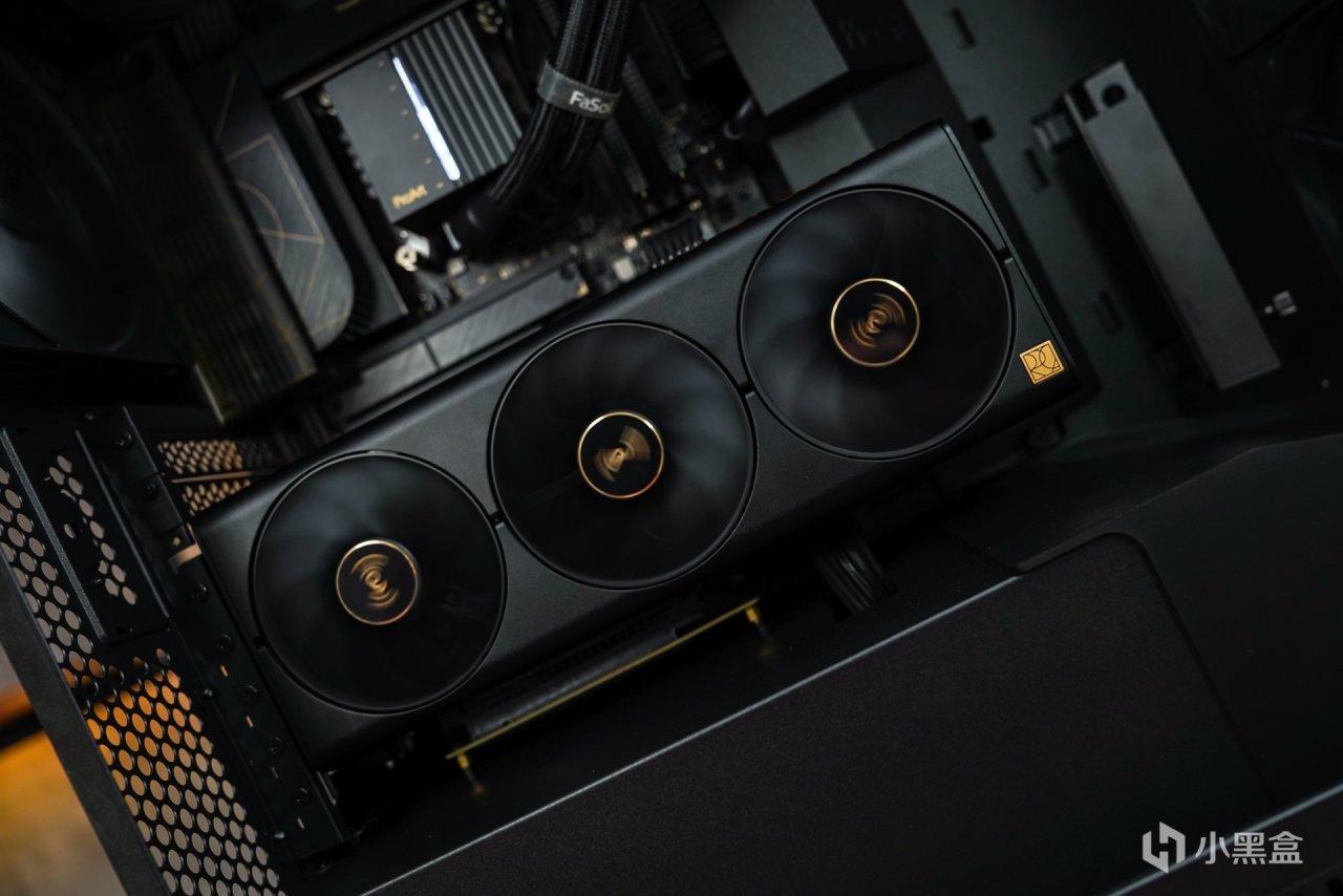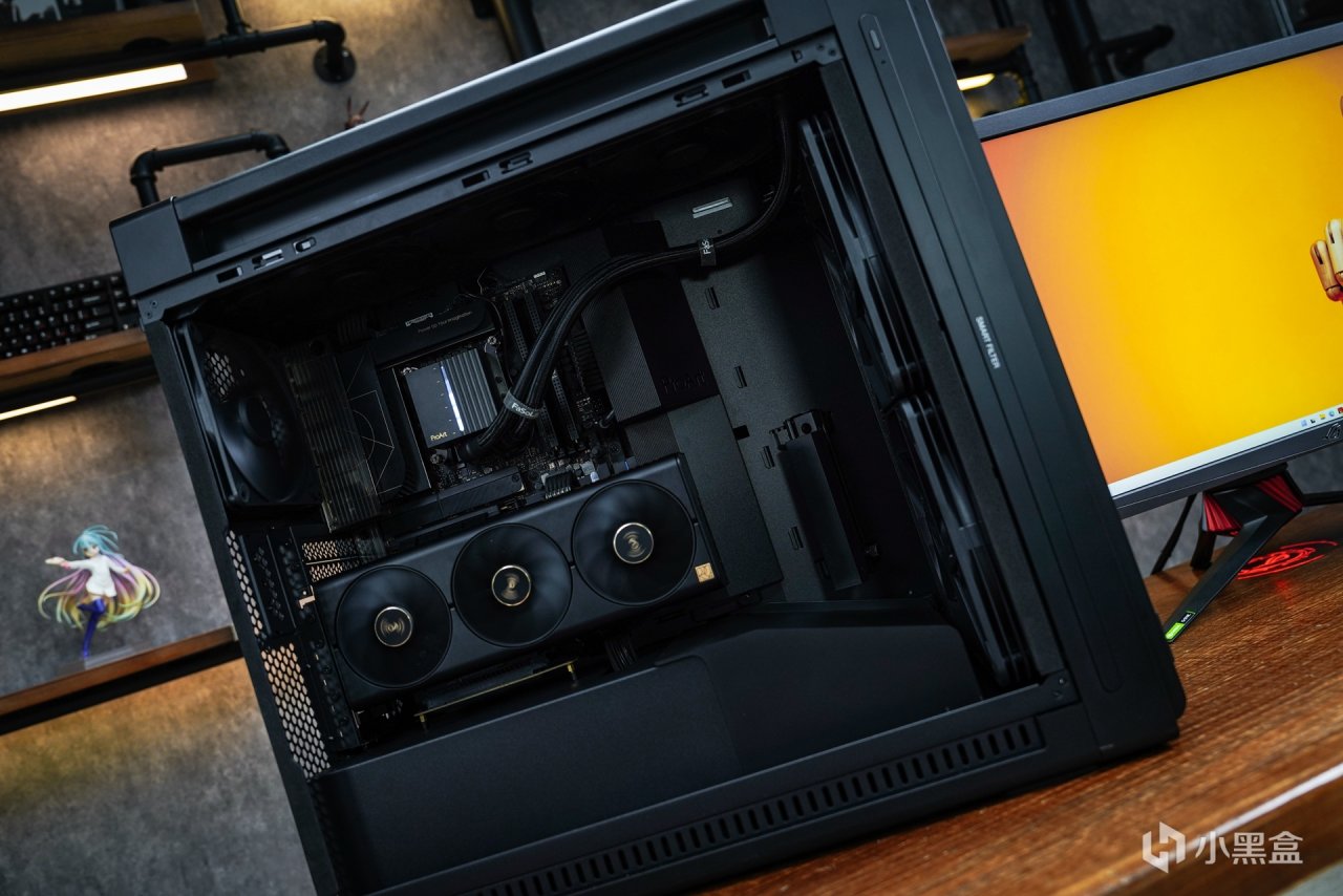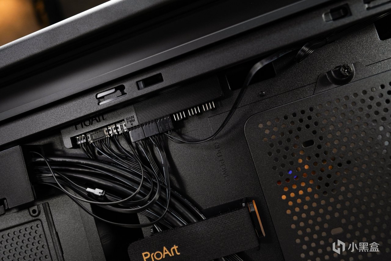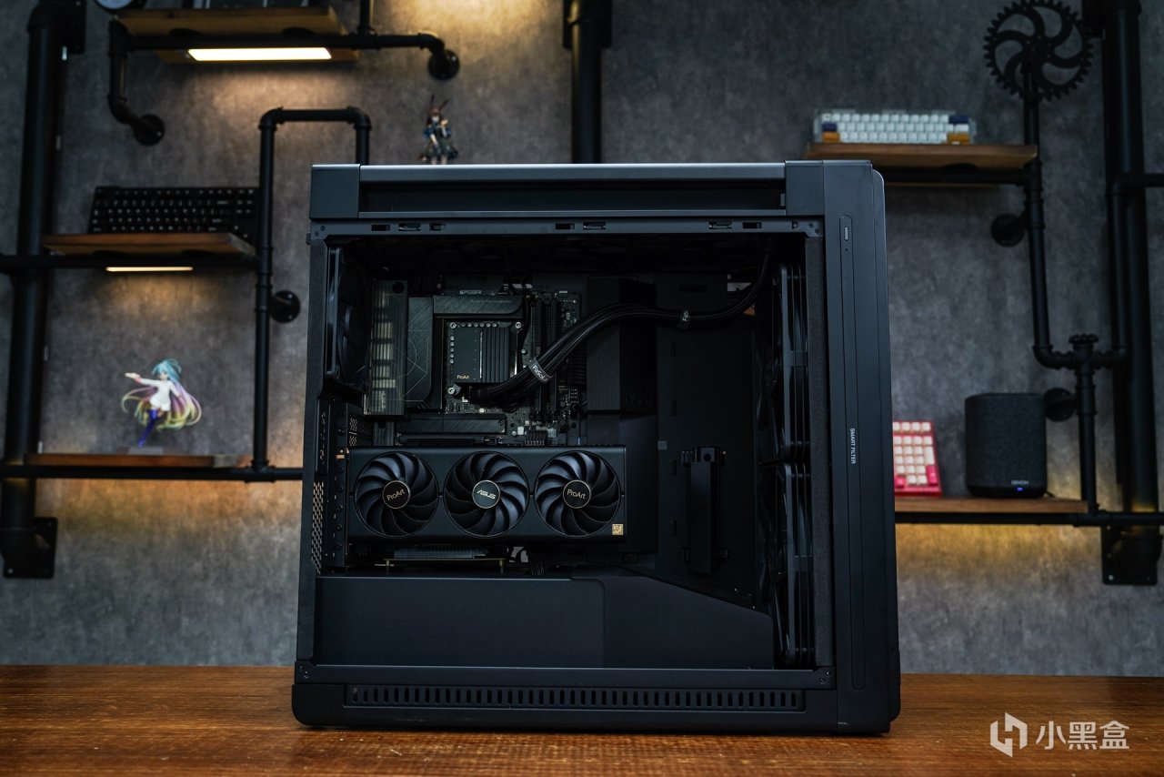 其实类似这种大箱体在安装上应该没什么太大兼容问题出现,所以在这就把安装中自己的一些感受谈下:首先是这款机箱的空间确实非常的大,对于整个pro art的硬件安装进箱体内就稍显小家气了,无论是主板还是显卡pro art系列都是中规中矩的,特别是显卡采用30CM长度和双槽设计,就算是顶级一点的4080/4080S显卡也是这样的尺寸,内部空间要是常规安装的,整体出来的效果有一种喂不饱这个箱体空间的视觉差。当然了设计机箱时不能单纯考虑这些配件的体积大小,而是要考虑到其他大型硬件的兼容。所以如何把这些空间视觉差来填满呢?个人给点小意见:1、采用双卡组合,这样可以让机箱下半部分没那么空。2、要是单卡的情况下,采用竖装的形式来补强空间视觉差。所以我采用的是后者。
