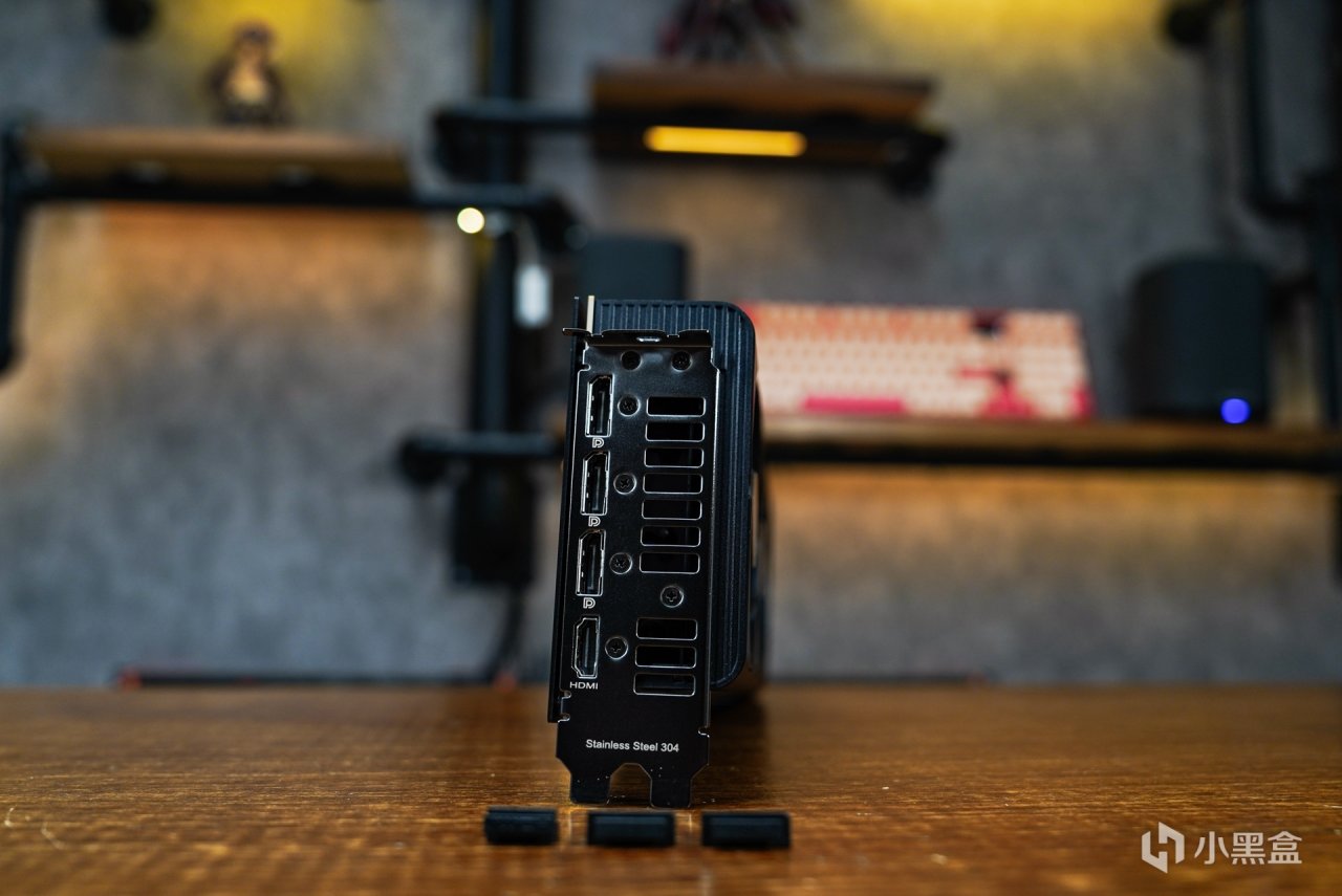 显卡两侧的散热模块采用三段式散热片设计,鳍片和4根热管均做了黑化处理,让整个散热模块能更好的融入显卡的外观设计中。而50MM的高度对比FE公版的61MM更薄,占用的显卡槽位2.5槽,比公版的3槽位的设计更优秀。这样的尺寸应该是不少又想拥有高性能,又钟爱其小型化体积显卡玩家的又一新发现,但是对于大型机箱的话就略显小气了,不过也可以多卡使用的话,那么这张显卡的体积优势就非常突出了,反正这张显卡在体积上的设计有优点也有缺点。