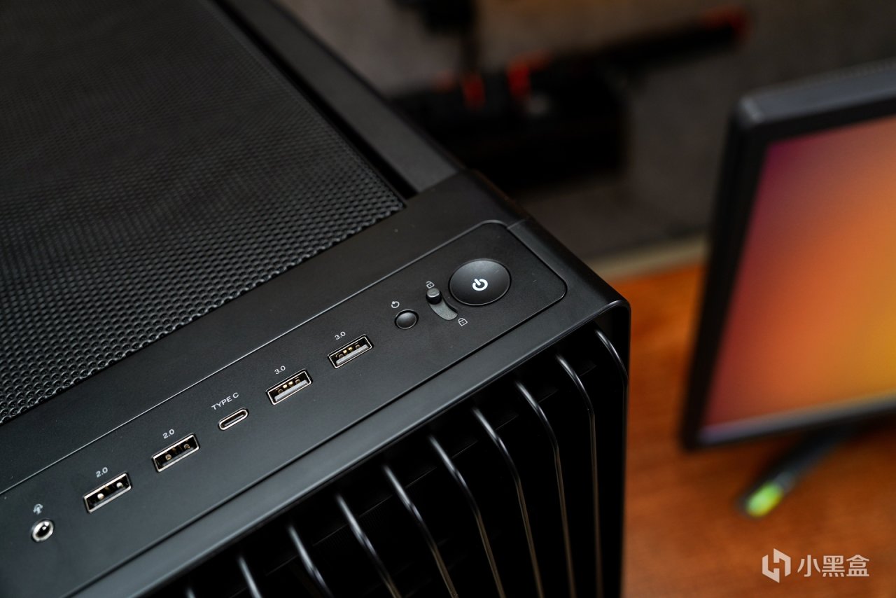 其顶部提手位置前置的内侧设计了按键,左右同时按下即可取下面板的快捷拆装设计。还首创了红外灰尘检测模块(靠近左下的小方块),搭配玻璃侧板前侧边上的检测按钮和灰尘指示灯,即可随时监控前置面板因为使用时间久了积灰情况,然后方便拆卸清理灰尘,这个在同类型的MESH面板机箱上确实算个“黑科技”。