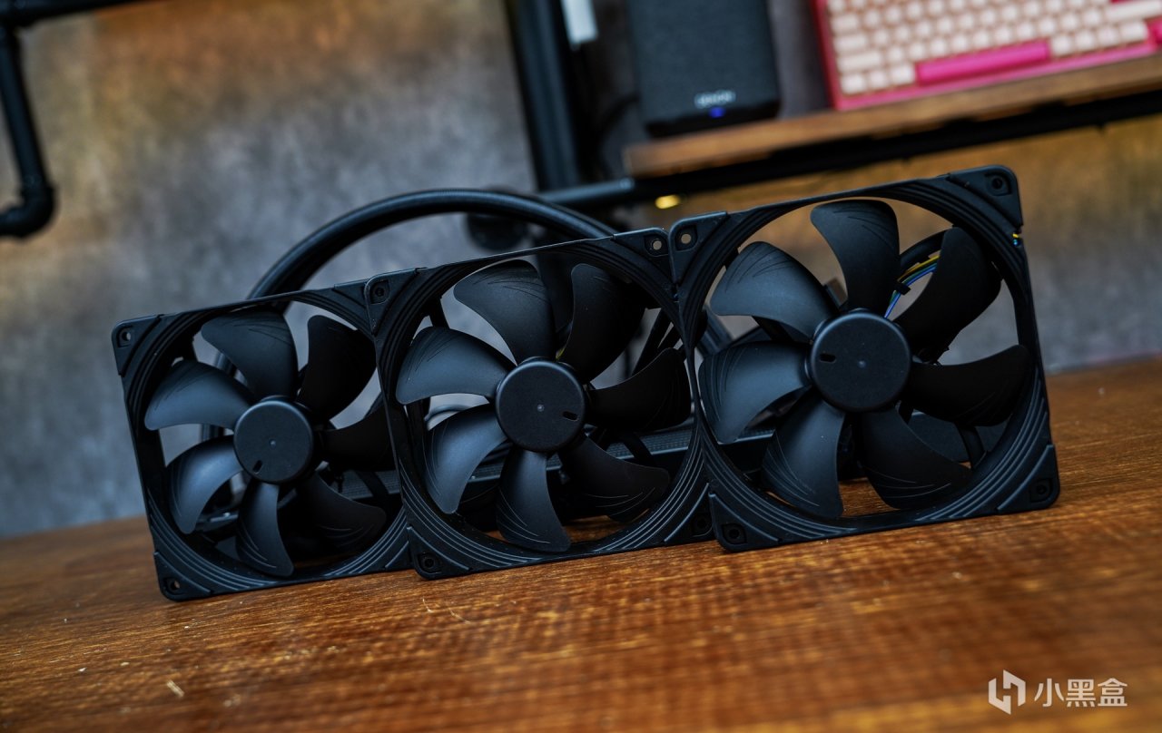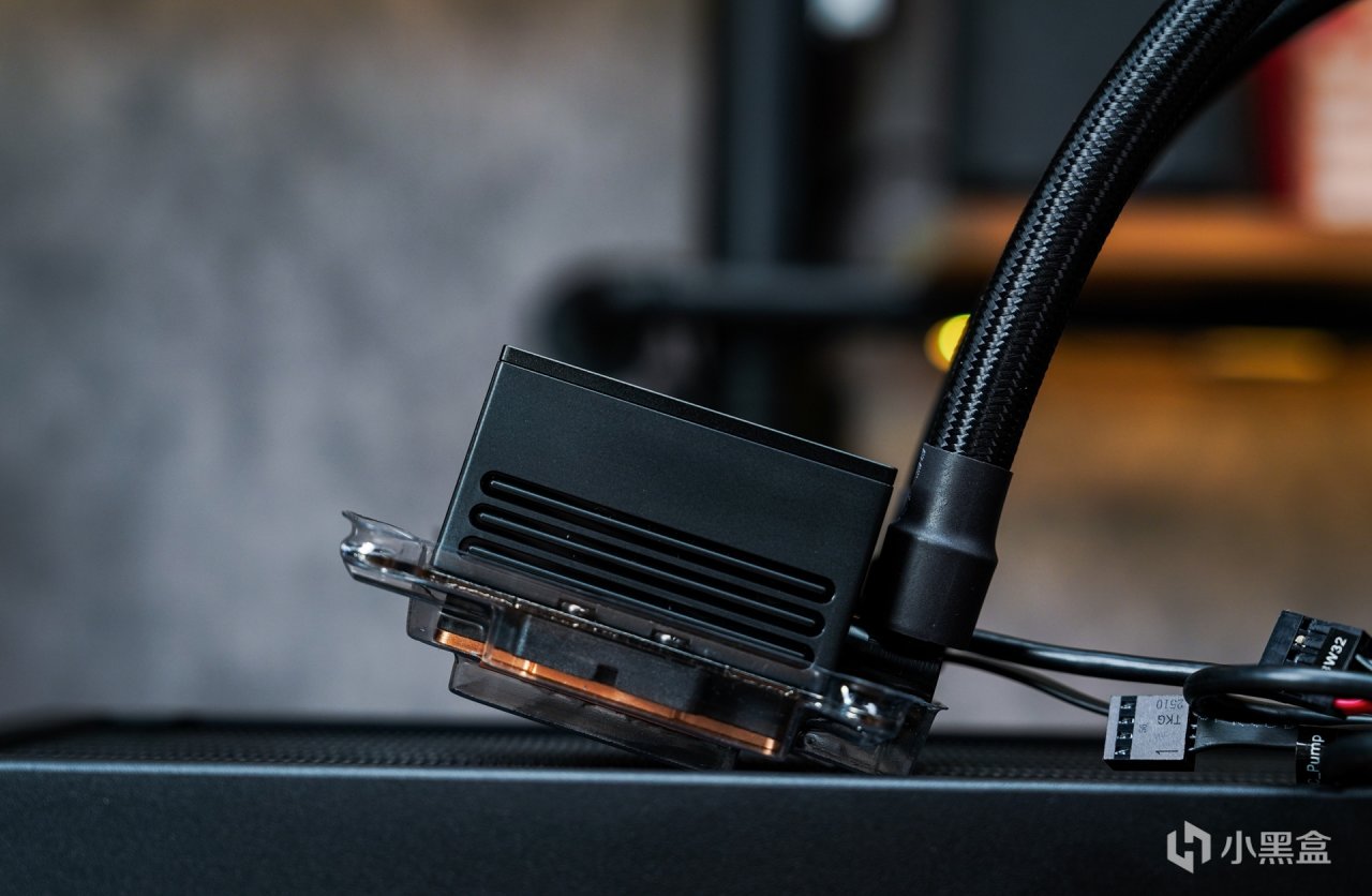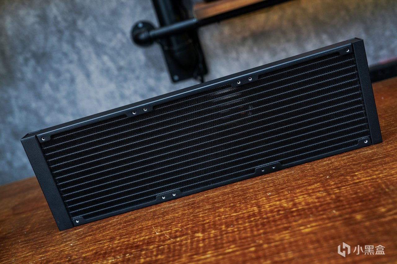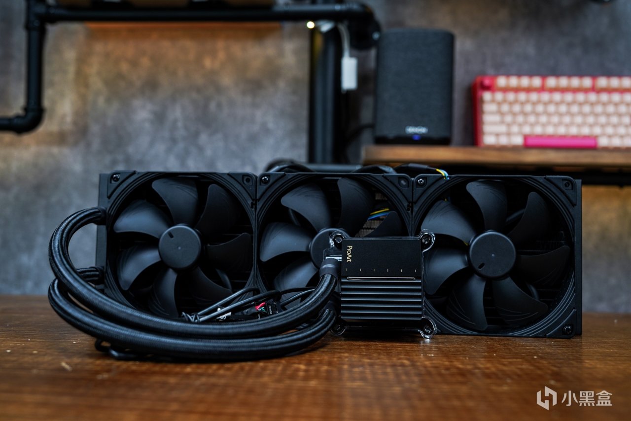 采用了更高规格的420MM尺寸冷排在无论在包装体积上又或者本体本体取出后,在整个体积上肯定比360水冷要稍大的。全黑设计也是这款水冷的标志,正好对应整套pro art硬件的设计定调。