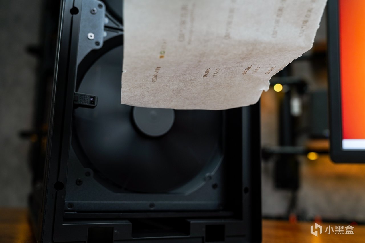 前置的2个20CM的大风扇是可以通过顶部的调控按键进行风速调整的,可以看到满速时的风力还是非常给力的,整张A4纸就算放到大概20-30CM处都会把其吸过去。这2个前置38mm 厚度 20CM 尺寸的大风扇的风压可达2.5mmH20的风压 190.2 CFM的风量,转速300-1000转。对比市面同类机箱的前置预装风扇,这款20CM尺寸的风扇可以说是很顶级的,风量足,风压大完全可以驾驭那么大空间的进风量,所以无论是风冷或者是水冷都是需要大面积进风来作为内部散热循环有力辅助。