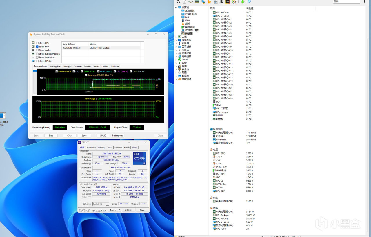 实测满载温度,看下整套从水冷到风道这些与散热有关联的硬件和箱体结构是否对于散热有帮助否?在CPU压温时均采用默频设置,核心电压为1.29V,核心功耗为368W,FPU满载温度CPU核心最高维持在96℃(PS:要是夏天常温的话,满载功耗和现在持平的话,温度应该是破百了),其他核心温度均维持在83~91℃之间。从实测数据来看,这款华硕PA420散热器对于顶级处理器的压温把控还是很不错的。另外显卡的满载烤机,GPU核心温度维持在64℃,热点温度74℃,显存温度维持在64℃,这也得益于前置进风和玻璃侧板的辅助进风有足够的冷风补充,让箱体在全面板闭合时拥有充足的散热循环。