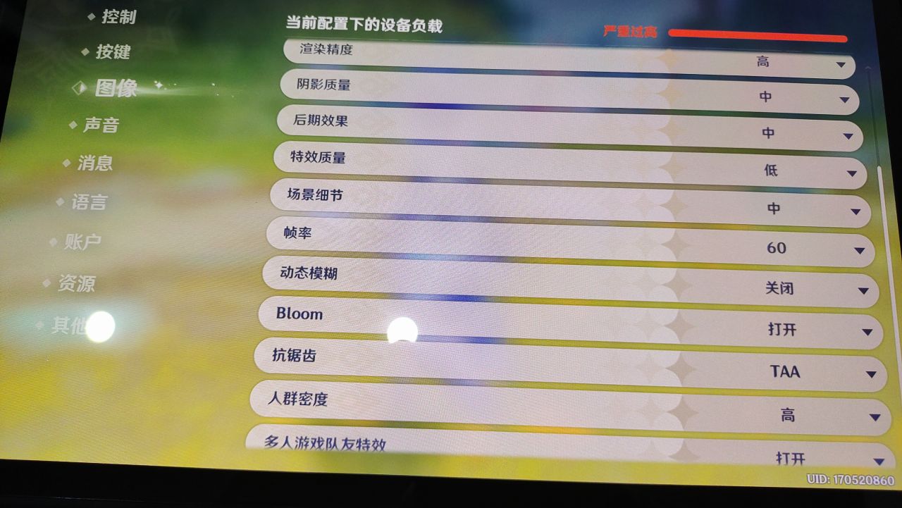 但是,联机队友进入世界、传送到新的地区时加载卡顿一下的问题还是会发生,总体没有原神电脑版流畅。个人的设置如下: