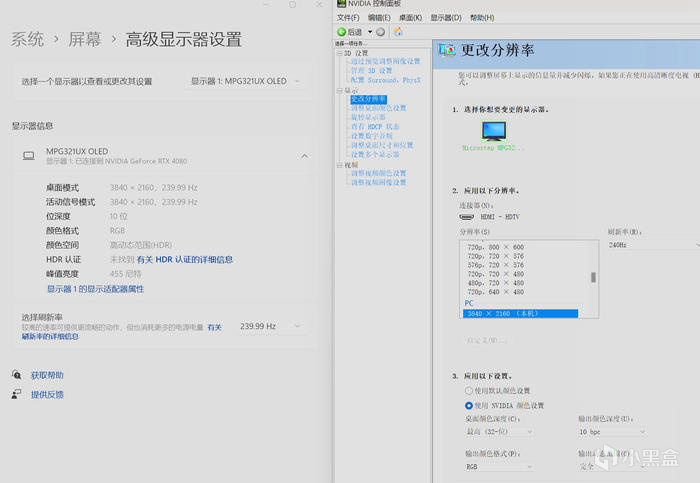 接入windows之后的显示器选项,直接可进入设置240Hz与10位全彩色深
