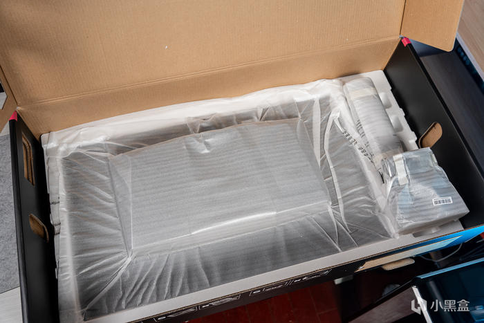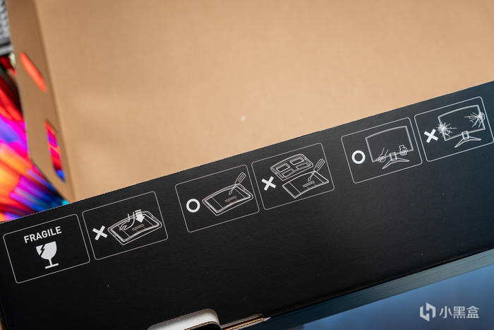 平铺摆放之后打开显示器包装,除了有易碎展示外,还有拿取显示器的方法,毕竟显示屏是非常脆弱的东西,特别是OLED屏幕更加薄的尺寸,需要托底移动,切忌不可直接抓屏移动