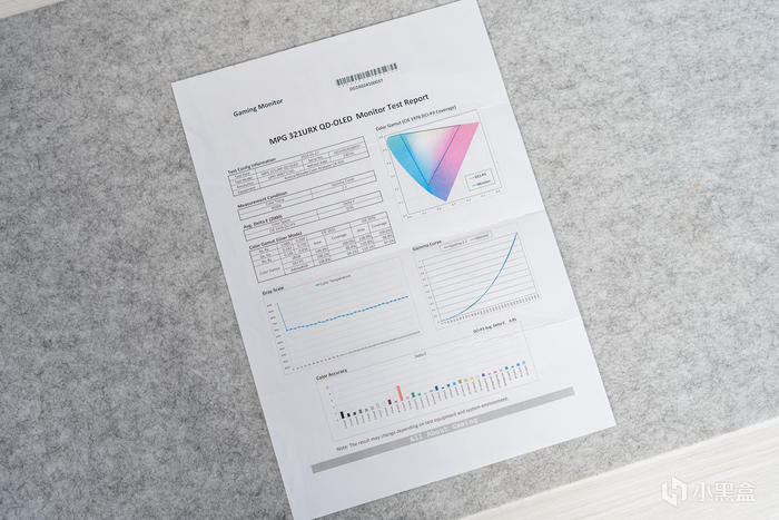 对了,显示器的边框信封袋中还有一份显示器的测试报告,展示了这款显示器的检测数据