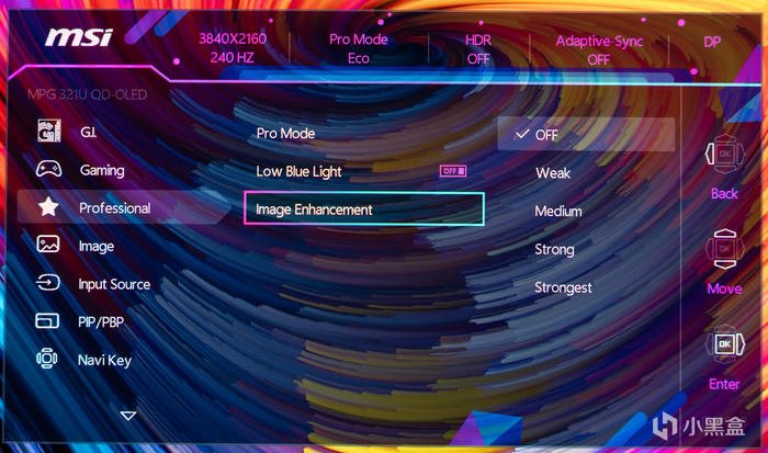 专业菜单可对色域选择、低蓝光功能、图像增强调节