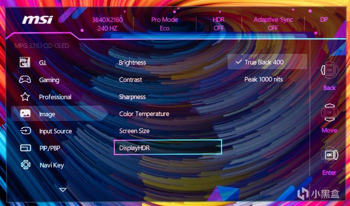 图像菜单可对亮度、对比度、清晰度、色温、屏幕尺寸、DisplayHDR进行调节,其中5档清晰度可提升图像的清晰度和细节,另DisplayHDR可选择True Black 400或者Peak 1000nits