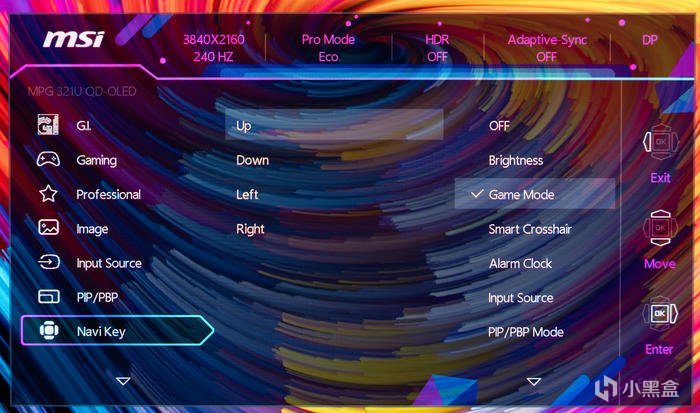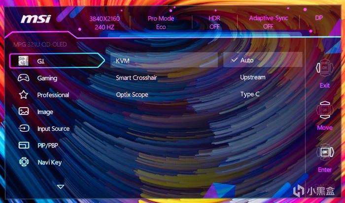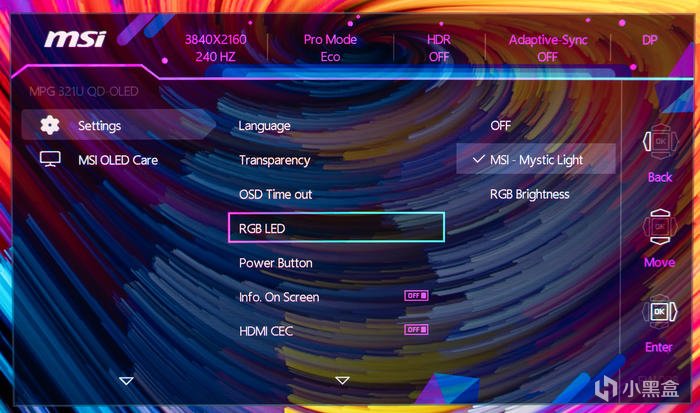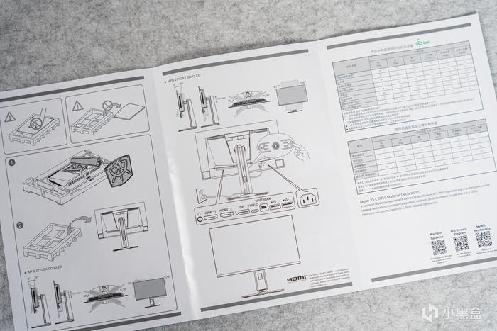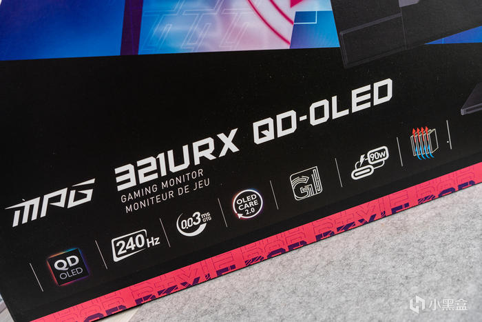 而这里的左下角除了标明产品型号外,还展示了产品大特点例如QD-OLED、240Hz刷新率、0.03msGTG灰阶响应时间、OLED CARE 2.0、Gi软件、90W PD口、以及散热技术,