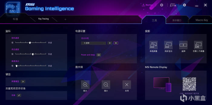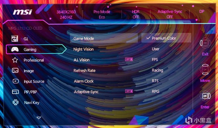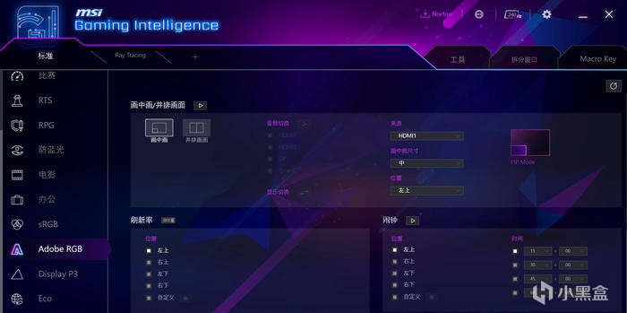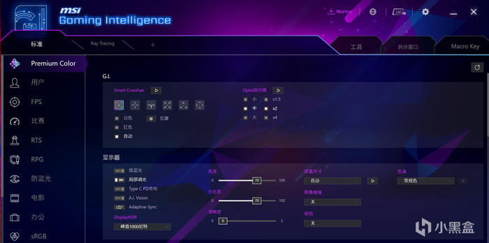 除了微星显示器的菜单,这款显示器还能使用微星的MSI Gaming Intelligence (G.I.)软件来做更详细的配置,安装软件和连接主机至显示器的USB接口之后打开GI,整个界面依然是很微星的蓝紫风格,顶部显示软件名称与右边的刷新率和设置按钮,中间为标准菜单和RayTracing菜单,以及右边的工具和拆分窗口、MacroKey菜单,而整个底部则是左边的色彩选择与右边的具体配置信息,这里选择了色彩Premium Color,右边的GI两大游戏工具,下面为显示器调节选项,其中DisplayHDR可选择峰值1000尼特或者TRUE BLACK 400