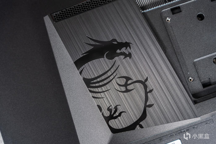取出显示器,轻轻得托底取出,一个铝质的龙盾图案非常显眼