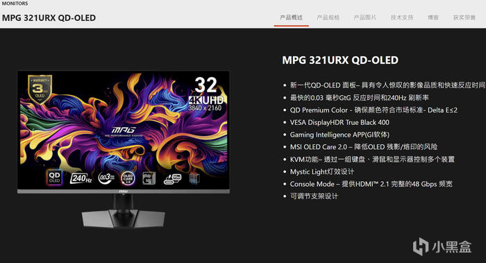 这是微星这款MPG 321URX QD-OLED显示器的主要特性介绍,当然主要是采用了新一代的QD-OLED面板,附带产生的特点为240Hz刷新率与0.03毫秒的GTG响应时间,还有Delte E≤2、VESA DisplayHDR True Black 400、Gi软体、微星自家的MSI OLED Care 2.0 降低OLED残影/烙印风险的技术、和KVM功能、微星Mystic Light灯效、48Gbps的完整HDMI2.1、可调节支架等等。不过除了这些还有更多的特点: