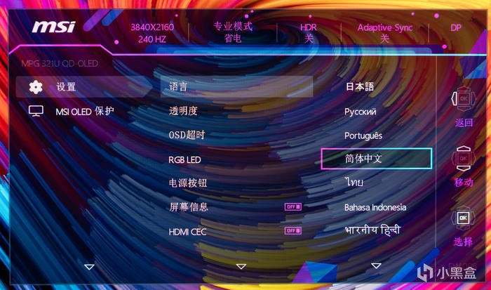 设置菜单可对整个显示器的功能如语言、菜单透明度、菜单超时、背部RGB灯控制、电源按钮、显示屏幕信息选项、HDMI CEC联动开机