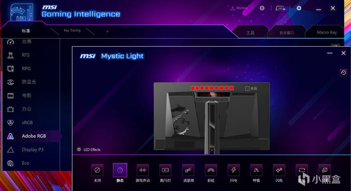 而灯的特效可以在显示器菜单或者如图所示的微星GI软件中的MYSTIC LIGHT中设置,不过需要连接显示器的USB线缆