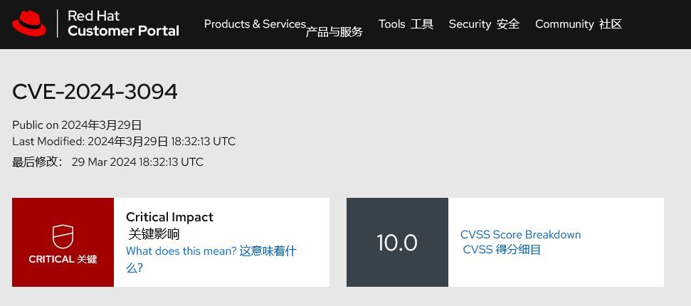 Red Hat 现正跟踪这一供应链安全问题,将其命名为 CVE-2024-3094,并将其严重性评分定为 10/10,同时在 Fedora 40 测试版中恢复使用5.4.x版本的 XZ。