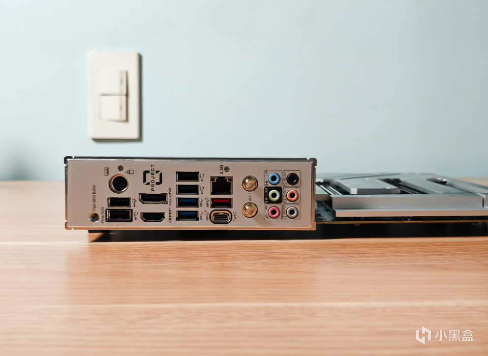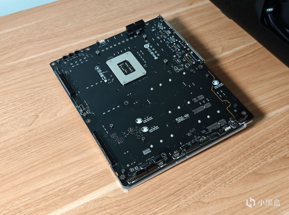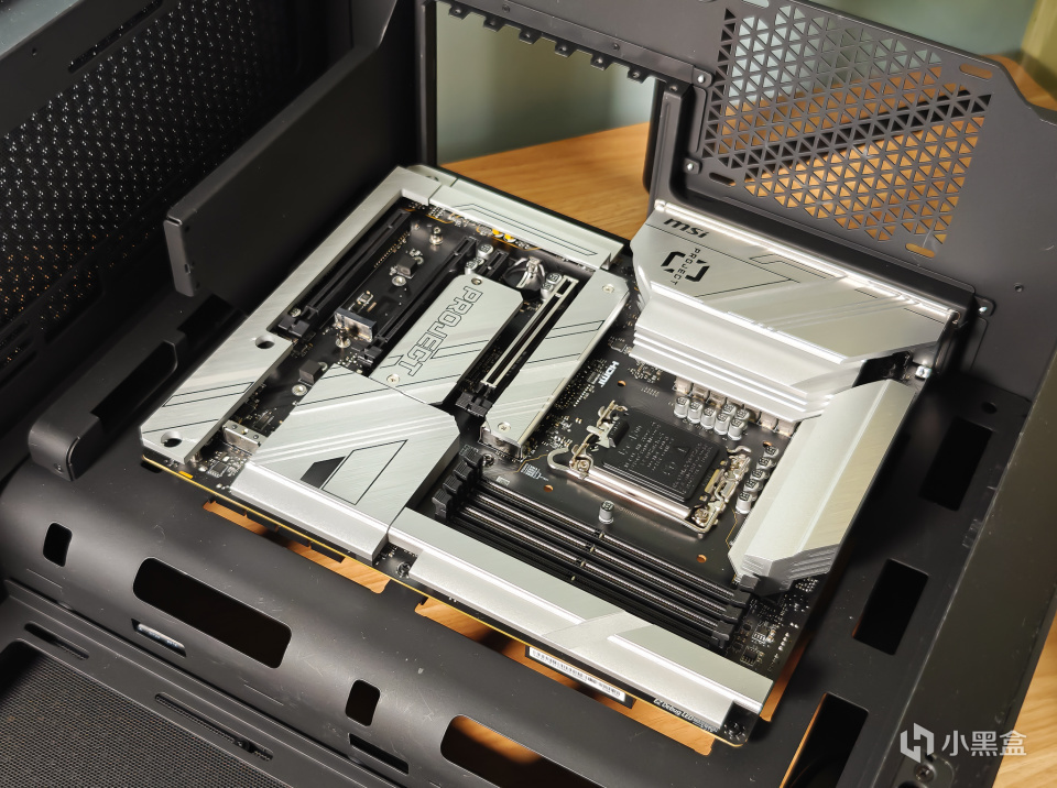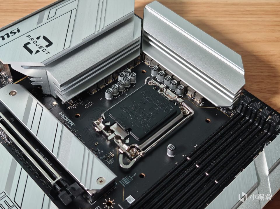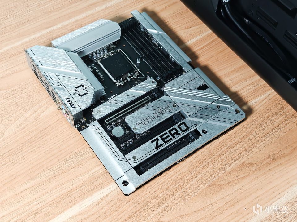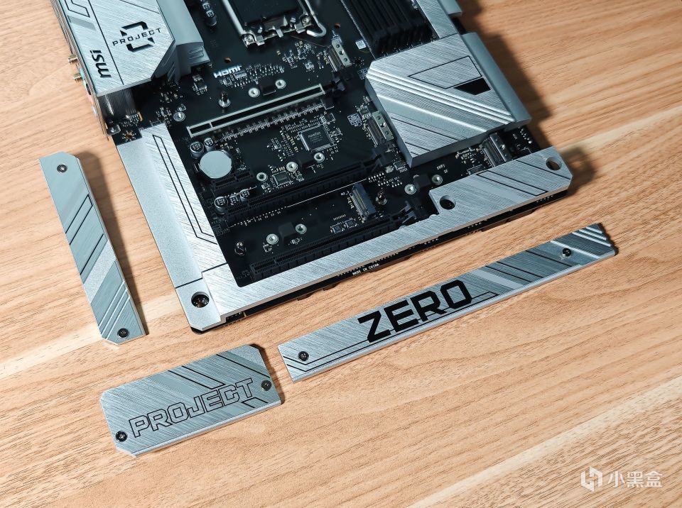 这款Z790 PROJECT ZERO,黑色主板,但全身覆盖了大片的银色装甲,拉丝条纹,占据了主板2/3左右的区域,在提供良好散热效果的同时,也让这款主板可以适应白色主题和黑色主题,增强了适应性。普通主板以往边角都是各种接口,现在这款背插主板,则是被银色装甲覆盖了。