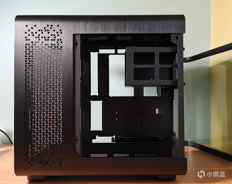 机箱的左侧面则是有大片的通风孔,分别在左侧竖排以及右侧的可拆卸背板上面。机身黑色,丝纹表面设计,彰显高贵品质。有一点可能出乎大家的预料,这款是铝制机箱,框架、侧板、背板等都是铝制的,厚度高达2.5mm,自然不是普通的钢板机箱可比。