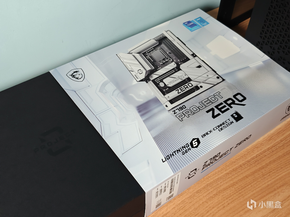 主板是微星的新款背插主板Z790 PROJECT ZERO,富有特色的包装盒和图案,支持雷电5和背插式非常醒目的标记。