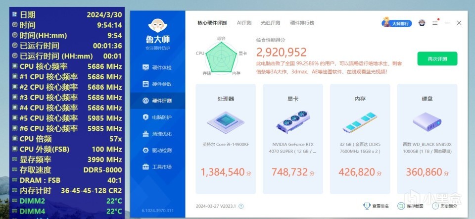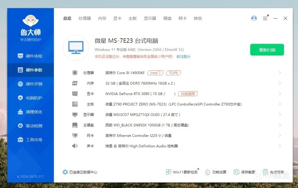 运行鲁大师,看看系统配置,CPU是英特尔i9-14900KF,内存是金百达刃DDR5 7600MHz,主板是微星Z790 PROJECT ZERO,显示器是微星MPG 271 QRX QD-OLED。