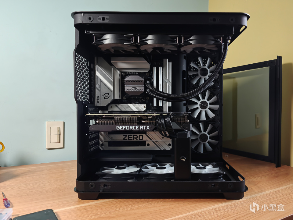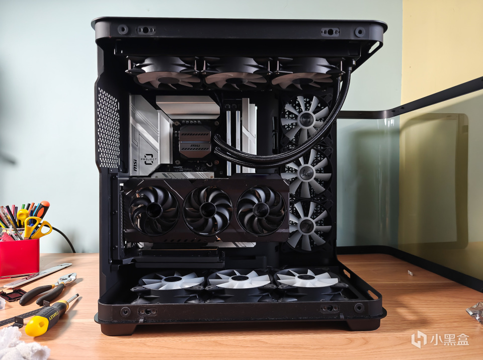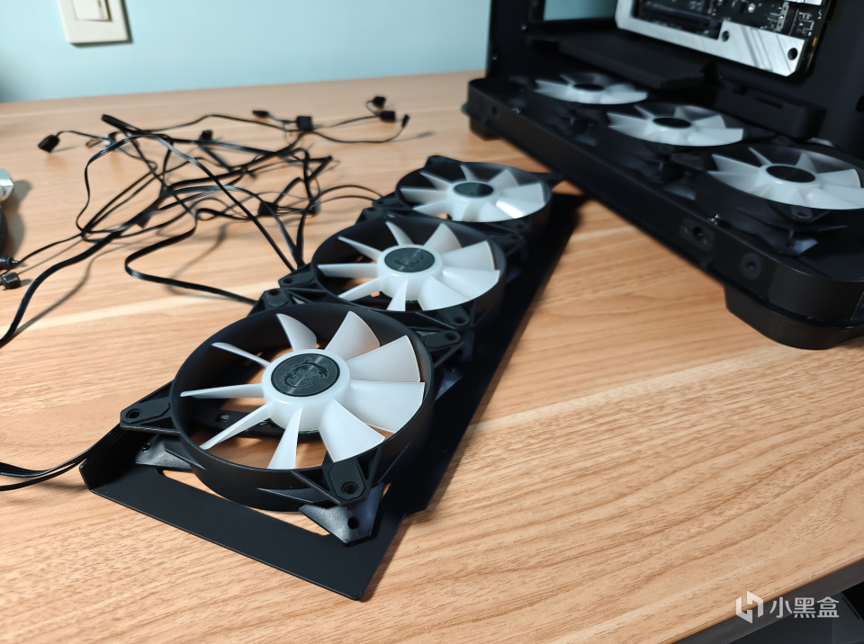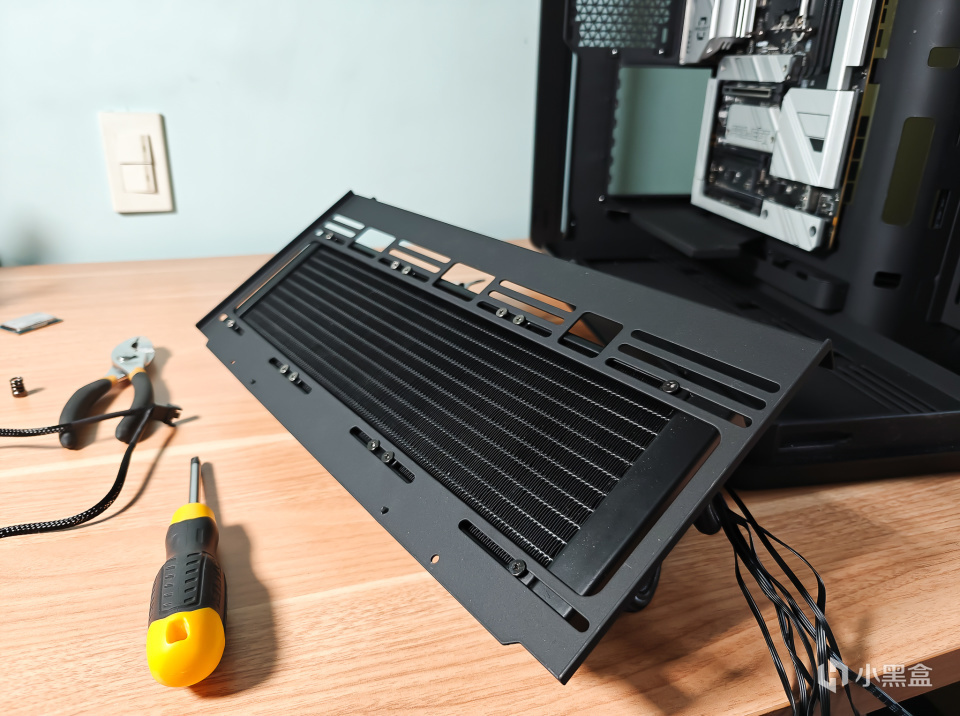 然后将支架挂到顶部,用手拧螺丝即可固定。然后将水冷头固定好,将线材穿到背板后面,这样,除了水冷头的线,基本看不到线材了。