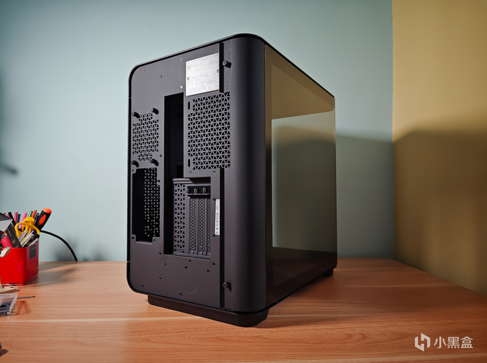 机箱设计整体圆润,边角都是有弧度的,同弧形玻璃的风格非常统一。机箱后部可以看出电源在背板位置,后面有一个12cm风扇位置。值得注意的是,pcie插槽采用了竖排默认支持竖插显卡,令人耳目一新。
