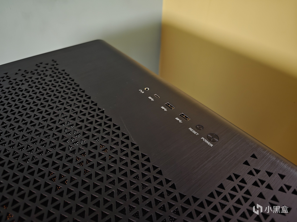 机箱顶部有大面积通风孔,散热效果应该不错。机箱IO面板位于顶部右侧,有电源、重启、2个USB-A接口,支持USB 3.2 Gen 1,一个USB-C接口,支持USB 3.2 Gen 2x2 (20Gbps,需要主板支持),一个音响接口。