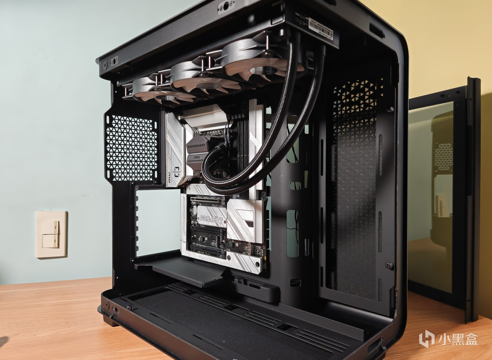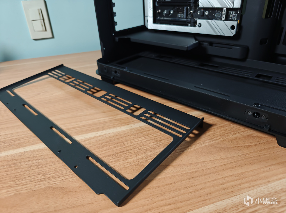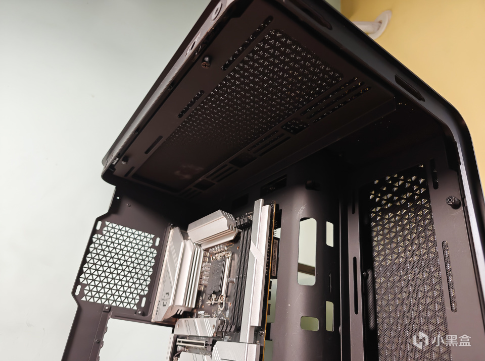 下一步则是准备安装水冷,主板传统的方式安装到顶部。普通机箱我们是将水冷排在顶部固定,而这款机箱,顶部是有一个支架,拧松2颗免工具螺丝,就可以将支架取下。