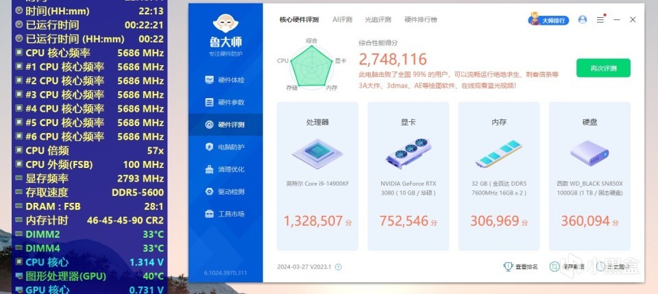 运行鲁大师,在内存默频5600MHz的情况下,跑分是274万分。