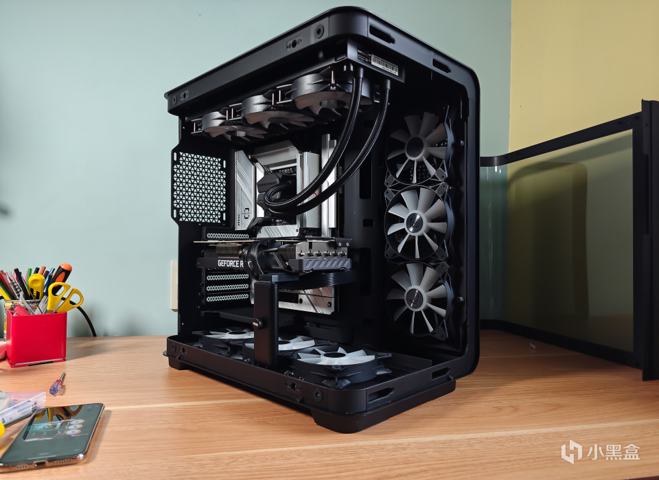 这款机箱有很多的布线孔,方便线就近穿越到背板后面。这样当6个风扇安装完毕后,不仔细看基本不会注意到线的存在。