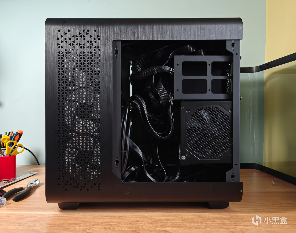 后部空间,装好硬盘笼和电源后,可以看到有非常宽敞的空间用于走线和理线,对于理线强迫症,可以整理的很漂亮。对我来说,差不多就可以了,盖上盖什么都看不见。
