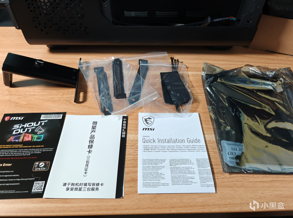 除去纸质资料外,还有竖装显卡转接线(右侧),显卡支架(左侧,横装显卡时用)等。