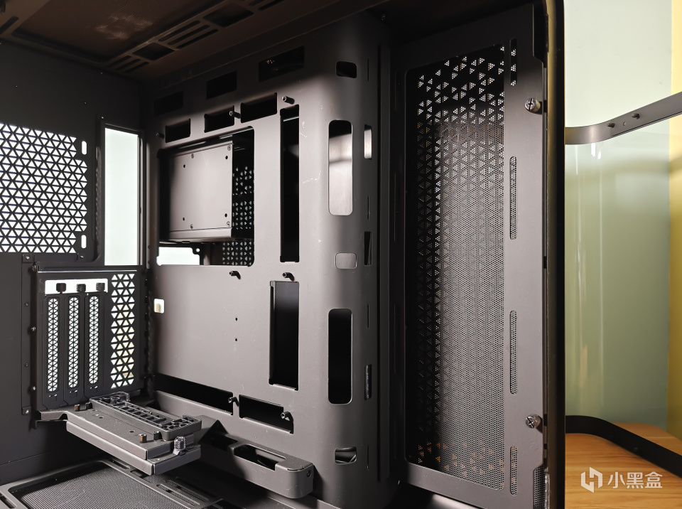 看看机箱内部,机箱非常宽大,可以看出,这款主板到背板的孔洞非常多,因为是支持背插主板的机箱,所以预留了端子的位置。当然,它也支持常规的主板。规格从最小的ITX到M-ATX、ATX乃至于最大的E-ATX都支持。