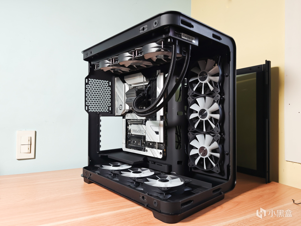 从风扇支持上说,它的后侧支持一个120mm风扇,顶部和底部最多支持140mmx3风扇,侧面支持最多120mmx3风扇。水冷的话,顶部、底部、侧面都最大支持360水冷。最多可以有10个风扇,数量众多,通风效果一定不错。而且顶部、底部、侧面都是有可拆卸框架的,风扇、水冷冷排,都是可以将框架拆洗,安装风扇/水冷排后再安装,非常方便。